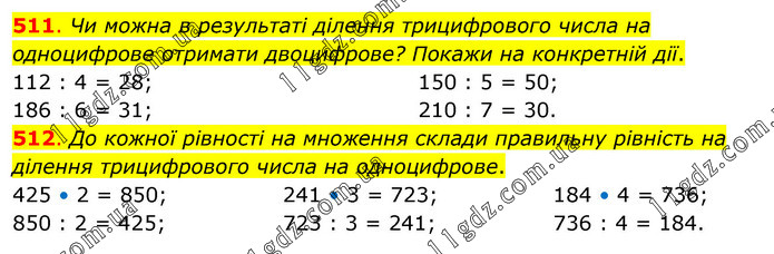 511. Чи можна в результаті ділення трицифрового числа на одноцифрове отримати двоцифрове? Покажи на конкретній дії. 112 : 4 = 28; 186 : 6 = 31; 150 : 5 = 50; 210 : 7 = 30. 512. До кожної рівності на множення склади правильну рівність на ділення трицифрового числа на одноцифрове. 425 • 2 = 850; 850 : 2 = 425; 241 • 3 = 723; 723 : 3 = 241; 184 • 4 = 736; 736 : 4 = 184.