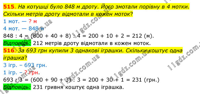 515. На котушці було 848 м дроту. Його змотали порівну в 4 мотки. Скільки метрів дроту відмотали в кожен моток? 1 мот. — ? м 4 мот. — 848 м 848 : 4 = (800 + 40 + 8) : 4 = 200 + 10 + 2 = 212 (м). Відповідь: 212 метрів дроту відмотали в кожен моток. 516. За 693 грн купили 3 однакові іграшки. Скільки коштує одна іграшка? 3 ігр. – 693 грн. 1 ігр. – ? грн. 693 : 3 = (600 + 90 + 3) : 3 = 200 + 30 + 1 = 231 (грн.) Відповідь: 231 гривня коштує одна іграшка.