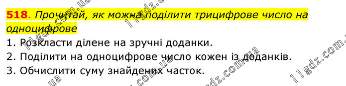 Прочитай, як можна поділити трицифрове число на одноцифрове 1. Розкласти ділене на зручні доданки. 2. Поділити на одноцифрове число кожен із доданків. 3. Обчислити суму знайдених часток.