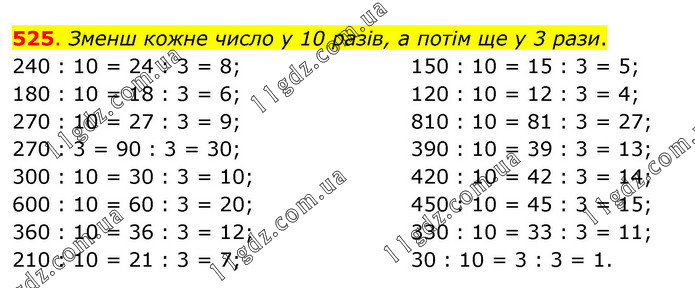 Зменш кожне число у 10 разів, а потім ще у 3 рази. 240 : 10 = 24 : 3 = 8; 180 : 10 = 18 : 3 = 6; 270 : 10 = 27 : 3 = 9; 270 : 3 = 90 : 3 = 30; 300 : 10 = 30 : 3 = 10; 600 : 10 = 60 : 3 = 20; 360 : 10 = 36 : 3 = 12; 210 : 10 = 21 : 3 = 7; 150 : 10 = 15 : 3 = 5; 120 : 10 = 12 : 3 = 4; 810 : 10 = 81 : 3 = 27; 390 : 10 = 39 : 3 = 13; 420 : 10 = 42 : 3 = 14; 450 : 10 = 45 : 3 = 15; 330 : 10 = 33 : 3 = 11; 30 : 10 = 3 : 3 = 1.
