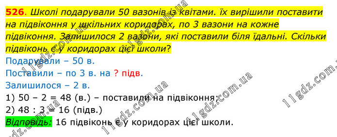 Школі подарували 50 вазонів із квітами. їх вирішили поставити на підвіконня у шкільних коридорах, по 3 вазони на кожне підвіконня. Залишилося 2 вазони, які поставили біля їдальні. Скільки підвіконь є у коридорах цієї школи? Подарували – 50 в. Поставили – по 3 в. на ? підв. Залишилося – 2 в. 1) 50 – 2 = 48 (в.) – поставили на підвіконня; 2) 48 : 3 = 16 (підв.) Відповідь: 16 підвіконь є у коридорах цієї школи.