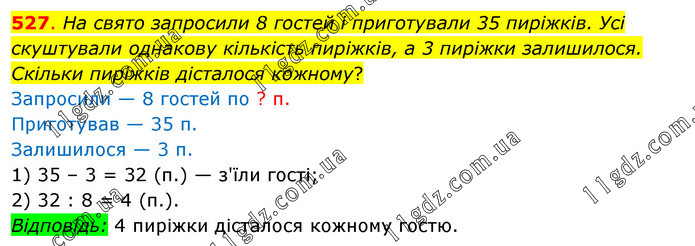 На свято запросили 8 гостей і приготували 35 пиріжків. Усі скуштували однакову кількість пиріжків, а 3 пиріжки залишилося. Скільки пиріжків дісталося кожному? Запросили — 8 гостей по ? п. Приготував — 35 п. Залишилося — 3 п. 1) 35 – 3 = 32 (п.) — з'їли гості; 2) 32 : 8 = 4 (п.). Відповідь: 4 пиріжки дісталося кожному гостю.