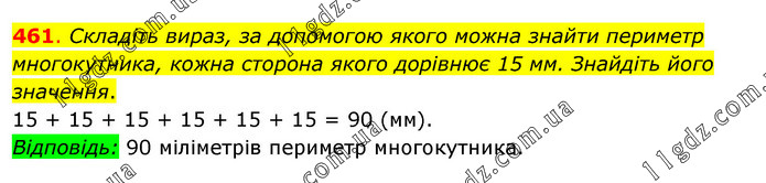 Складіть вираз, за допомогою якого можна знайти периметр многокутника, кожна сторона якого дорівнює 15 мм. Знайдіть його значення. 15 + 15 + 15 + 15 + 15 + 15 = 90 (мм). Відповідь: 90 міліметрів периметр многокутника.