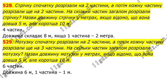 528. Стрічку спочатку розрізали на 2 частини, а потім кожну частину розрізали ще на 2 частини. На скільки частин загалом розрізали стрічку? Назви довжину стрічки у метрах, якщо відомо, що вона довша 5 м, але коротша 10 м. 4 частин. Довжина складає 8 м, якщо 1 частина – 2 метра. 529. Мотузку спочатку розрізали на 2 частини, а потім кожну частину розрізали ще на 3 частини. На скільки частин загалом розрізали мотузку? Назви довжину мотузки у метрах, якщо відомо, що вона довша 5 м, але коротша 10 м. 6 частин. Довжина 6 м, 1 частина – 1 м.
