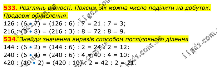533. Розглянь рівності. Поясни, як можна число поділити на добуток. Продовж обчислення. 126 : (6 • 7) = (126 : 6) : 7 = 21 : 7 = 3; 216 : (3 • 8) = (216 : 3) : 8 = 72 : 8 = 9. 534. Знайди значення виразів способом послідовного ділення 144 : (6 • 2) = (144 : 6) : 2 = 24 : 2 = 12; 240 : (6 • 4) = (240 : 6) : 4 = 40 : 4 = 10; 420 : (10 • 2) = (420 : 10) : 2 = 42 : 2 = 21.