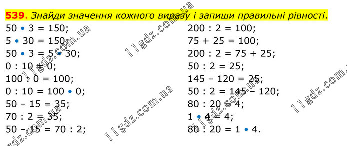 Знайди значення кожного виразу і запиши правильні рівності. 50 • 3 = 150; 5 • 30 = 150; 50 • 3 = 5 • 30; 0 : 10 = 0; 100 : 0 = 100; 0 : 10 = 100 • 0; 50 – 15 = 35; 70 : 2 = 35; 50 – 15 = 70 : 2; 200 : 2 = 100; 75 + 25 = 100; 200 : 2 = 75 + 25; 50 : 2 = 25; 145 – 120 = 25; 50 : 2 = 145 – 120; 80 : 20 = 4; 1 • 4 = 4; 80 : 20 = 1 • 4.