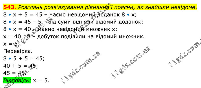 Розглянь розв'язування рівняння і поясни, як знайшли невідоме. 8 • х + 5 = 45 – маємо невідомий доданок 8 • х; 8 • х = 45 – 5 – від суми відняли відомий доданок; 8 • х = 40 – маємо невідомий множник х; х = 40 : 8 – добуток поділили на відомий множник. х = 5; Перевірка. 8 • 5 + 5 = 45; 40 + 5 = 45; 45 = 45. Відповідь: х = 5.