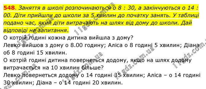 Заняття в школі розпочинаються о 8 : 30, а закінчуються о 14 : 00. Діти прийшли до школи за 5 хвилин до початку занять. У таблиці подано час, який діти витрачають на шлях від дому до школи. Дай відповіді на запитання. О котрій годині кожна дитина вийшла з дому? Левко вийшов з дому о 8.00 годину; Аліса о 8 годині 5 хвилин; Діана об 8 годині 15 хвилин. О котрій годині дитина повернеться додому, якщо на шлях додому витрачається на 10 хвилин більше? Левко повернеться додому о 14 годині 35 хвилин; Аліса – о 14 годині 30 хвилин; Діана – о 14 годині 20 хвилин.