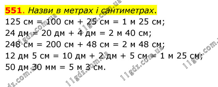 Назви в метрах і сантиметрах. 125 см = 100 см + 25 см = 1 м 25 см; 24 дм = 20 дм + 4 дм = 2 м 40 см; 248 см = 200 см + 48 см = 2 м 48 см; 12 дм 5 см = 10 дм + 2 дм + 5 см = 1 м 25 см; 50 дм 30 мм = 5 м 3 см.