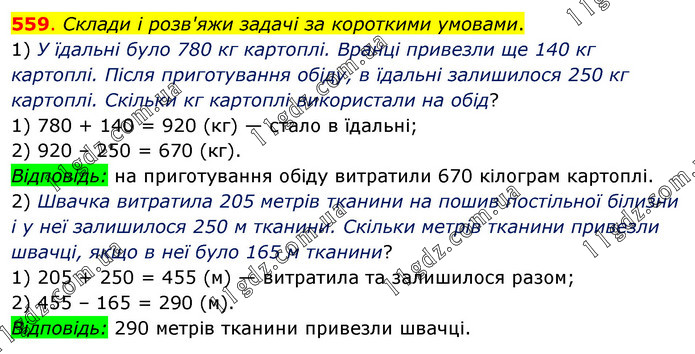 Склади і розв'яжи задачі за короткими умовами. 1) У їдальні було 780 кг картоплі. Вранці привезли ще 140 кг картоплі. Після приготування обіду, в їдальні залишилося 250 кг картоплі. Скільки кг картоплі використали на обід? 1) 780 + 140 = 920 (кг) — стало в їдальні; 2) 920 – 250 = 670 (кг). Відповідь: на приготування обіду витратили 670 кілограм картоплі. 2) Швачка витратила 205 метрів тканини на пошив постільної білизни і у неї залишилося 250 м тканини. Скільки метрів тканини привезли швачці, якщо в неї було 165 м тканини? 1) 205 + 250 = 455 (м) — витратила та залишилося разом; 2) 455 – 165 = 290 (м). Відповідь: 290 метрів тканини привезли швачці.