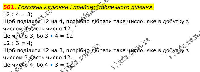 Розглянь малюнки і прийоми табличного ділення. 12 : 4 = 3; Щоб поділити 12 на 4, потрібно дібрати таке число, яке в добутку з числом 4 дасть число 12. Це число 3, бо 3 • 4 = 12 12 : 3 = 4; Щоб поділити 12 на 3, потрібно дібрати таке число, яке в добутку з числом 3 дасть число 12. Це число 4, бо 4 • 3 = 12.