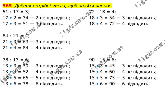 Добери потрібні числа, щоб знайти частки. 51 : 17 = 3; 17 • 2 = 34 — 2 не підходить; 17 • 3 = 51 — 3 підходить. 72 : 18 = 4; 18 • 3 = 54 — 3 не підходить; 18 • 4 = 72 — 4 підходить. 84 : 21 = 4; 21 • 3 = 63 — 3 не підходить; 21 • 4 = 84 — 4 підходить. 78 : 13 = 6; 13 • 3 = 39 — 3 не підходить; 13 • 4 = 52 — 4 не підходить; 13 • 5 = 65 — 5 не підходить; 13 • 6 = 78 — 6 підходить. 90 : 15 = 6; 15 • 3 = 45 — 3 не підходить; 15 • 4 = 60 — 4 не підходить; 15 • 5 = 75 — 5 не підходить; 15 • 6 = 90 — 6 підходить.