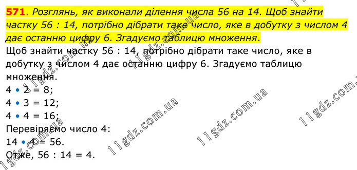 Розглянь, як виконали ділення числа 56 на 14. Щоб знайти частку 56 : 14, потрібно дібрати таке число, яке в добутку з числом 4 дає останню цифру 6. Згадуємо таблицю множення. Щоб знайти частку 56 : 14, потрібно дібрати таке число, яке в добутку з числом 4 дає останню цифру 6. Згадуємо таблицю множення. 4 • 2 = 8; 4 • 3 = 12; 4 • 4 = 16; Перевіряємо число 4: 14 • 4 = 56. Отже, 56 : 14 = 4.