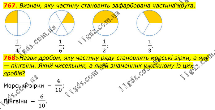 767. Визнач, яку частину становить зафарбована частина круга. 1/4; 1/6; 1/2; 1/3. 768. Назви дробом, яку частину ряду становлять морські зірки, а яку — пінгвіни. Який чисельник, а який знаменник у кожному із цих дробів? Морські зірки − 4/10; Пінгвіни − 6/10.