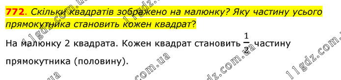 Скільки квадратів зображено на малюнку? Яку частину усього прямокутника становить кожен квадрат? На малюнку 2 квадрата. Кожен квадрат становить 1/2 частину прямокутника (половину).