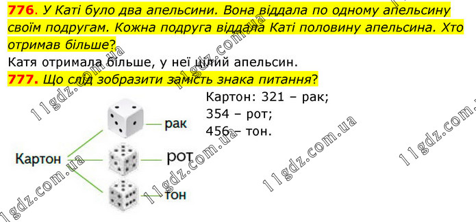 776. У Каті було два апельсини. Вона віддала по одному апельсину своїм подругам. Кожна подруга віддала Каті половину апельсина. Хто отримав більше? Катя отримала більше, у неї цілий апельсин. 777. Що слід зобразити замість знака питання? Картон: 321 – рак; 354 – рот; 456 – тон.