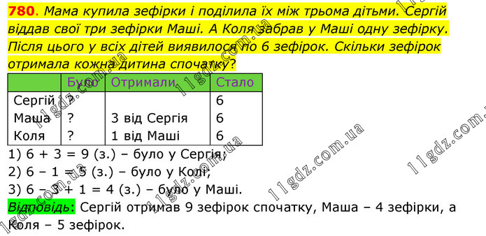 Мама купила зефірки і поділила їх між трьома дітьми. Сергій віддав свої три зефірки Маші. А Коля забрав у Маші одну зефірку. Після цього у всіх дітей виявилося по 6 зефірок. Скільки зефірок отримала кожна дитина спочатку? 1) 6 + 3 = 9 (з.) – було у Сергія; 2) 6 – 1 = 5 (з.) – було у Колі; 3) 6 – 3 + 1 = 4 (з.) – було у Маші. Відповідь: Сергій отримав 9 зефірок спочатку, Маша – 4 зефірки, а Коля – 5 зефірок.