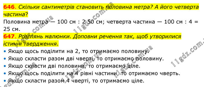 646. Скільки сантиметрів становить половина метра? А його четверта частина? Половина метра — 100 см : 2 50 см; четверта частина — 100 см : 4 = 25 см. 647. Розглянь малюнки. Доповни речення так, щоб утворилися істинні твердження. • Якщо щось поділити на 2, то отримаємо половину. • Якщо скласти разом дві чверті, то отримаємо половину. • Якщо скласти дві половини, то отримаємо ціле. • Якщо щось поділити на 4 рівні частини, то отримаємо чверть. • Якщо скласти разом 4 чверті, то отримаємо ціле.