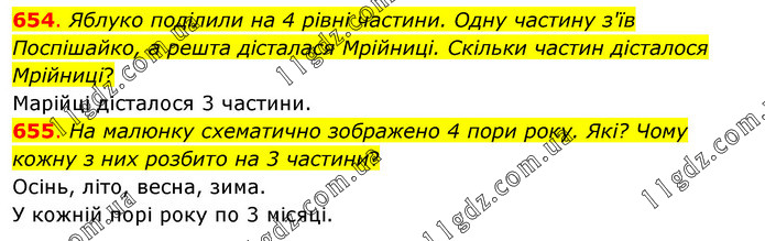 654. Яблуко поділили на 4 рівні частини. Одну частину з'їв Поспішайко, а решта дісталася Мрійниці. Скільки частин дісталося Мрійниці? Марійці дісталося 3 частини. 655. На малюнку схематично зображено 4 пори року. Які? Чому кожну з них розбито на 3 частини? Осінь, літо, весна, зима. У кожній порі року по 3 місяці.
