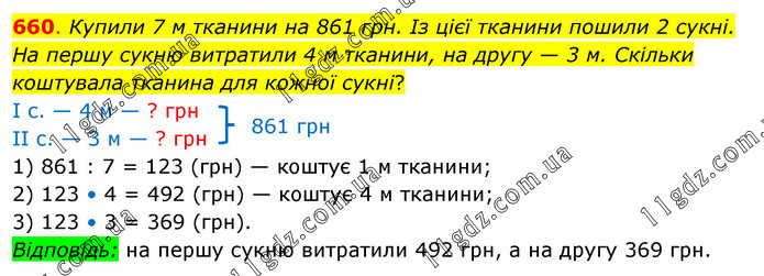 Купили 7 м тканини на 861 грн. Із цієї тканини пошили 2 сукні. На першу сукню витратили 4 м тканини, на другу — 3 м. Скільки коштувала тканина для кожної сукні? І с. — 4 м — ? грн ІІ с. — 3 м — ? грн 1) 861 : 7 = 123 (грн) — коштує 1 м тканини; 2) 123 • 4 = 492 (грн) — коштує 4 м тканини; 3) 123 • 3 = 369 (грн). Відповідь: на першу сукню витратили 492 грн, а на другу 369 грн.