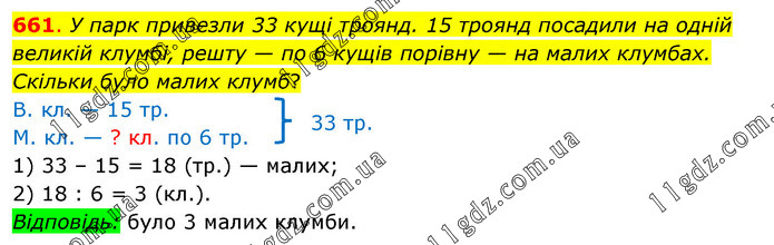У парк привезли 33 кущі троянд. 15 троянд посадили на одній великій клумбі, решту — по 6 кущів порівну — на малих клумбах. Скільки було малих клумб? В. кл. — 15 тр. М. кл. — ? кл. по 6 тр. 1) 33 – 15 = 18 (тр.) — малих; 2) 18 : 6 = 3 (кл.). Відповідь: було 3 малих клумби.