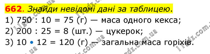 Знайди невідомі дані за таблицею. 1) 750 : 10 = 75 (г) — маса одного кекса; 2) 200 : 25 = 8 (шт.) — цукерок; 3) 10 • 12 = 120 (г) — загальна маса горіхів.