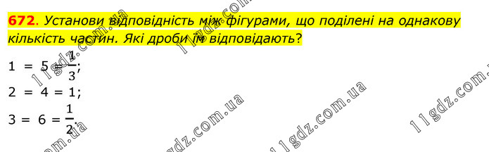 Установи відповідність між фігурами, що поділені на однакову кількість частин. Які дроби їм відповідають? 1 = 5 = 1/3; 2 = 4 = 1; 3 = 6 = 1/2.