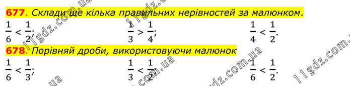 677. Склади ще кілька правильних нерівностей за малюнком. 1/6 < 1/2; 1/3 > 1/4; 1/4 < 1/2. 678. Порівняй дроби, використовуючи малюнок 1/6 < 1/3; 1/3 < 1/2; 1/6 < 1/2.
