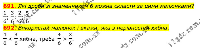 691. Які дроби зі знаменником 6 можна скласти за цими малюнками? 1/6; 3/6; 2/6; 5/6. 692. Використай малюнок і вкажи, яка з нерівностей хибна. 4/6 < 3/6 хибна, треба 4/6 > 3/6.