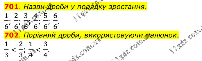 701. Назви дроби у порядку зростання. 1/6; 2/6; 3/6; 4/6; 5/6; 6/6. 702. Порівняй дроби, використовуючи малюнок. 1/3 < 2/3; 1/4 < 3/4.