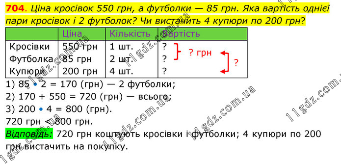 Ціна кросівок 550 грн, а футболки — 85 грн. Яка вартість однієї пари кросівок і 2 футболок? Чи вистачить 4 купюри по 200 грн? 1) 85 • 2 = 170 (грн) — 2 футболки; 2) 170 + 550 = 720 (грн) — всього; 3) 200 • 4 = 800 (грн). 720 грн < 800 грн. Відповідь: 720 грн коштують кросівки і футболки; 4 купюри по 200 грн вистачить на покупку.