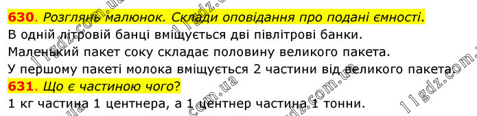 630. Розглянь малюнок. Склади оповідання про подані ємності. В одній літровій банці вміщується дві півлітрові банки. Маленький пакет соку складає половину великого пакета. У першому пакеті молока вміщується 2 частини від великого пакета. 631. Що є частиною чого? 1 кг частина 1 центнера, а 1 центнер частина 1 тонни.