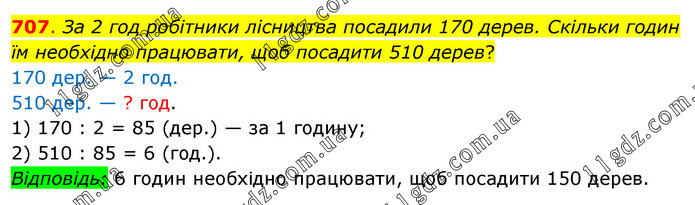 За 2 год робітники лісництва посадили 170 дерев. Скільки годин їм необхідно працювати, щоб посадити 510 дерев? 170 дер. — 2 год. 510 дер. — ? год. 1) 170 : 2 = 85 (дер.) — за 1 годину; 2) 510 : 85 = 6 (год.). Відповідь: 6 годин необхідно працювати, щоб посадити 150 дерев.