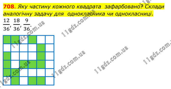 Яку частину кожного квадрата зафарбовано? Склади аналогічну задачу для однокласника чи однокласниці. 12/36, 18/36, 9/36.