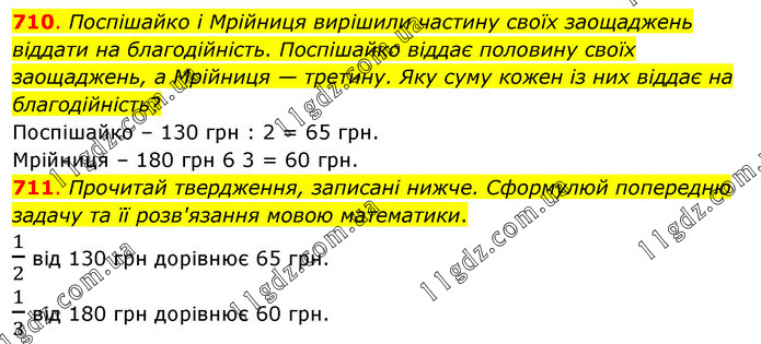 710. Поспішайко і Мрійниця вирішили частину своїх заощаджень віддати на благодійність. Поспішайко віддає половину своїх заощаджень, а Мрійниця — третину. Яку суму кожен із них віддає на благодійність? Поспішайко – 130 грн : 2 = 65 грн. Мрійниця – 180 грн 6 3 = 60 грн. 711. Прочитай твердження, записані нижче. Сформулюй попередню задачу та її розв'язання мовою математики. 1/2 від 130 грн дорівнює 65 грн. 1/3 від 180 грн дорівнює 60 грн.