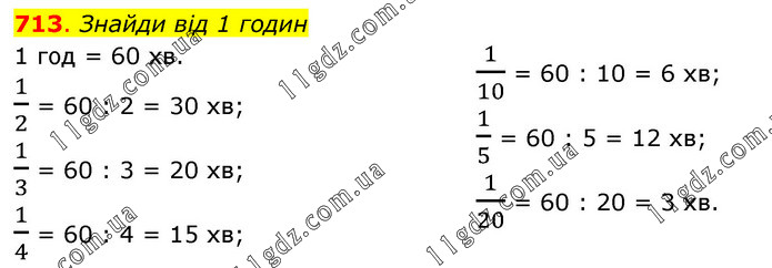 Знайди від 1 годин 1 год = 60 хв. 1/2 = 60 : 2 = 30 хв; 1/3 = 60 : 3 = 20 хв; 1/4 = 60 : 4 = 15 хв; 1/10 = 60 : 10 = 6 хв; 1/5 = 60 : 5 = 12 хв; 1/20 = 60 : 20 = 3 хв.