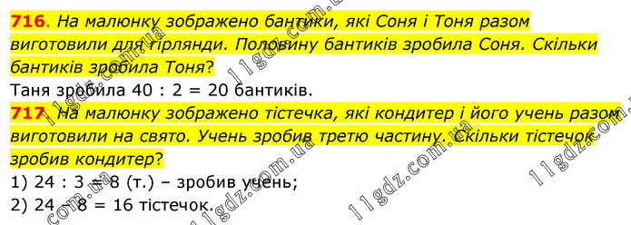716. На малюнку зображено бантики, які Соня і Тоня разом виготовили для гірлянди. Половину бантиків зробила Соня. Скільки бантиків зробила Тоня? Таня зробила 40 : 2 = 20 бантиків. 717. На малюнку зображено тістечка, які кондитер і його учень разом виготовили на свято. Учень зробив третю частину. Скільки тістечок зробив кондитер? 1) 24 : 3 = 8 (т.) – зробив учень; 2) 24 – 8 = 16 тістечок.