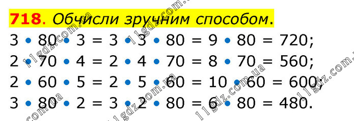 Обчисли зручним способом. 3 • 80 • 3 = 3 • 3 • 80 = 9 • 80 = 720; 2 • 70 • 4 = 2 • 4 • 70 = 8 • 70 = 560; 2 • 60 • 5 = 2 • 5 • 60 = 10 • 60 = 600; 3 • 80 • 2 = 3 • 2 • 80 = 6 • 80 = 480.