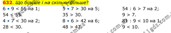 Що більше і на скільки більше? 6 • 9 < 55 на 1; 54 < 55. 4 • 7 < 30 на 2; 28 < 30. 5 • 7 > 30 на 5; 35 > 30. 8 • 6 > 42 на 6; 48 > 42. 54 : 6 > 7 на 2; 9 > 7. 81 : 9 < 10 на 1. 9 < 10.