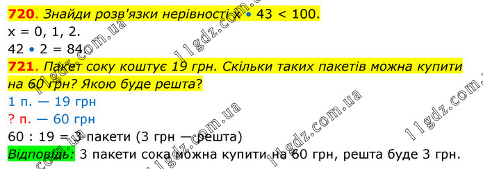 720. Знайди розв'язки нерівності х • 43 < 100. х = 0, 1, 2. 42 • 2 = 84. 721. Пакет соку коштує 19 грн. Скільки таких пакетів можна купити на 60 грн? Якою буде решта? 1 п. — 19 грн ? п. — 60 грн 60 : 19 = 3 пакети (3 грн — решта) Відповідь: 3 пакети сока можна купити на 60 грн, решта буде 3 грн.