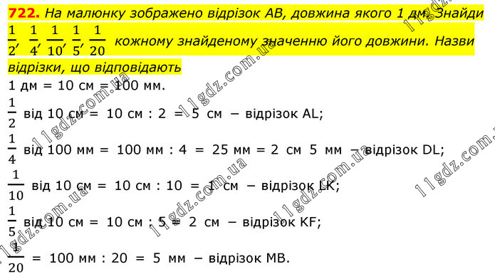 На малюнку зображено відрізок АВ, довжина якого 1 дм. Знайди 1/2, 1/4, 1/10, 1/5, 1/20 кожному знайденому значенню його довжини. Назви відрізки, що відповідають 1 дм = 10 см = 100 мм. 1/2 від 10 см = 10 см : 2 = 5 см − відрізок AL; 1/4 від 100 мм = 100 мм : 4 = 25 мм = 2 см 5 мм − відрізок DL; 1/10 від 10 см = 10 см : 10 = 1 см − відрізок LK; 1/5 від 10 см = 10 см : 5 = 2 см − відрізок KF; 1/20 = 100 мм : 20 = 5 мм − відрізок MB.