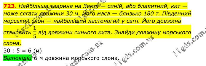 Найбільша тварина на Землі — синій, або блакитний, кит — може сягати довжини 30 м. Його маса — близько 180 т. Південний морський слон — найбільший ластоногий у світі. Його довжина становить 1/5 від довжини синього кита. Знайди довжину морського слона. 30 : 5 = 6 (м) Відповідь: 6 м довжина морського слона.