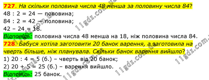 727. На скільки половина числа 48 менша за половину числа 84? 48 : 2 = 24 — половина; 84 : 2 = 42 — половина; 42 – 24 = 18. Відповідь: половина числа 48 менша на 18, ніж половина числа 84. 728. Бабуся хотіла заготовити 20 банок варення, а заготовила на чверть більше, ніж планувала. Скільки банок варення вийшло? 1) 20 : 4 = 5 (б.) – чверть від 20 банок; 2) 20 + 5 = 25 (б.) – варення вийшло. Відповідь: 25 банок.