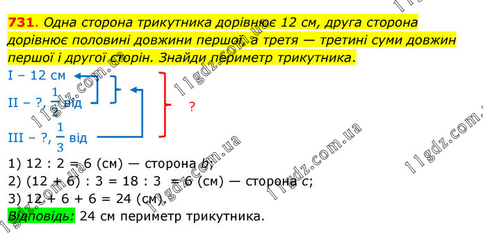 Одна сторона трикутника дорівнює 12 см, друга сторона дорівнює половині довжини першої, а третя — третині суми довжин першої і другої сторін. Знайди периметр трикутника. І – 12 см ІІ – ?, 1/2 від ІІІ – ?, 1/3 від 1) 12 : 2 = 6 (см) — сторона b; 2) (12 + 6) : 3 = 18 : 3 = 6 (см) — сторона с; 3) 12 + 6 + 6 = 24 (см). Відповідь: 24 см периметр трикутника.