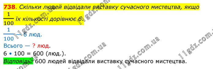 Скільки людей відвідали виставку сучасного мистецтва, якщо 1/100 їх кількості дорівнює 6. 1/100 — 6 люд. Всього — ? люд. 6 • 100 = 600 (люд.). Відповідь: 600 людей відвідали виставку сучасного мистецтва.