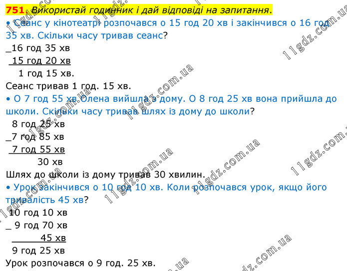 Використай годинник і дай відповіді на запитання. • Сеанс у кінотеатрі розпочався о 15 год 20 хв і закінчився о 16 год 35 хв. Скільки часу тривав сеанс? _16 год 35 хв 15 год 20 хв 1 год 15 хв. Сеанс тривав 1 год. 15 хв. • О 7 год 55 хв Олена вийшла з дому. О 8 год 25 хв вона прийшла до школи. Скільки часу тривав шлях із дому до школи? 8 год 25 хв _7 год 85 хв 7 год 55 хв 30 хв Шлях до школи із дому тривав 30 хвилин. • Урок закінчився о 10 год 10 хв. Коли розпочався урок, якщо його тривалість 45 хв? 10 год 10 хв _ 9 год 70 хв 45 хв 9 год 25 хв Урок розпочався о 9 год. 25 хв.