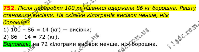 Після переробки 100 кг пшениці одержали 86 кг борошна. Решту становили висівки. На скільки кілограмів висівок менше, ніж борошна? 1) 100 – 86 = 14 (кг) — висівки; 2) 86 – 14 = 72 (кг). Відповідь: на 72 кілограми висівок менше, ніж борошна.