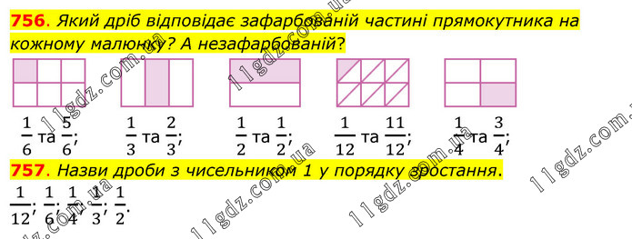 756. Який дріб відповідає зафарбованій частині прямокутника на кожному малюнку? А незафарбованій? 1/6 та 5/6; 1/3 та 2/3; 1/2 та 1/2; 1/12 та 11/12; 1/4 та 3/4; 757. Назви дроби з чисельником 1 у порядку зростання. 1/12; 1/6; 1/4; 1/3; 1/2.
