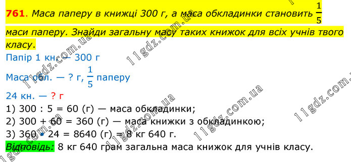 Маса паперу в книжці 300 г, а маса обкладинки становить 1/5 маси паперу. Знайди загальну масу таких книжок для всіх учнів твого класу. Папір 1 кн. — 300 г Маса обл. — ? г, 1/5 паперу 24 кн. — ? г 1) 300 : 5 = 60 (г) — маса обкладинки; 2) 300 + 60 = 360 (г) — маса книжки з обкладинкою; 3) 360 • 24 = 8640 (г) = 8 кг 640 г. Відповідь: 8 кг 640 грам загальна маса книжок для учнів класу.