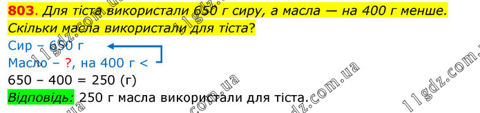 Для тіста використали 650 г сиру, а масла — на 400 г менше. Скільки масла використали для тіста? Сир – 650 г Масло – ?, на 400 г < 650 – 400 = 250 (г) Відповідь: 250 г масла використали для тіста.